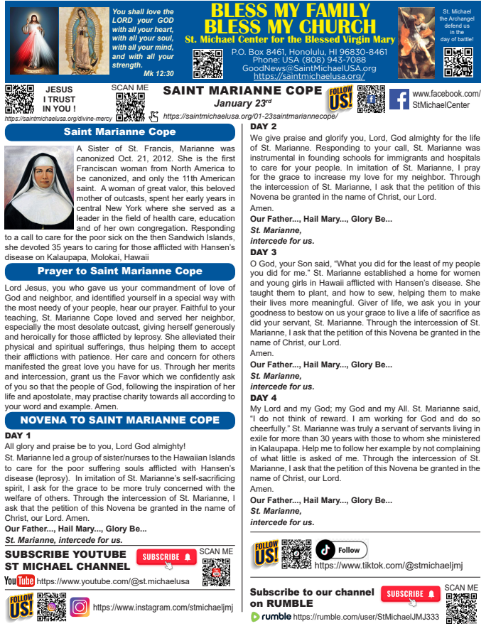 Faithful to your teaching, St. Marianne Cope loved and served her neighbor, especially the most desolate outcast, giving herself generously and heroically for those afflicted by leprosy. She alleviated their physical and spiritual sufferings, thus helping them to accept their afflictions with patience.