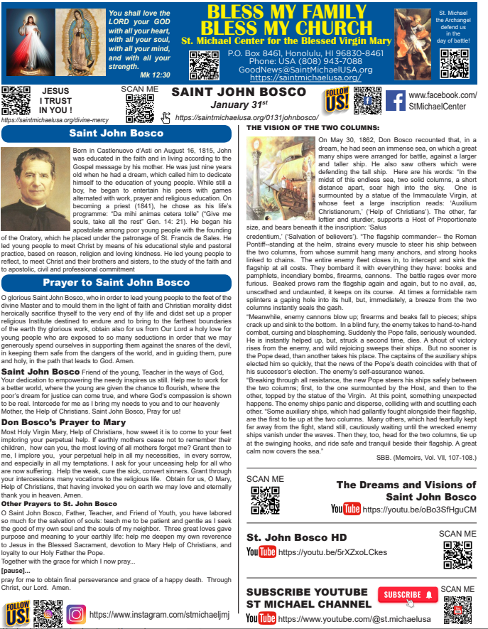 O Saint John Bosco, Father, Teacher, and Friend of Youth, you have labored so much for the salvation of souls: teach me to be patient and gentle as I seek the good of my own soul and the souls of my neighbor. Three great loves gave purpose and meaning to your earthly life: help me deepen my own reverence to Jesus in the Blessed Sacrament, devotion to Mary Help of Christians, and loyalty to our Holy Father the Pope.