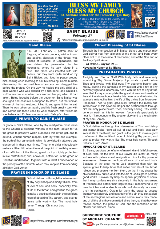 O St. Blaise, give us your conviction that our Catholic faith is the most precious treasure that we have, and that we would never give it up for anything in the world. May your example instil in us the courage to live our faith and enable us to respond to the moral demands of our faith. May the love of Jesus make us stronger every day.