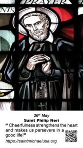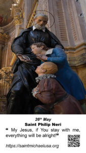 O glorious St. Philip, who wast so favored by God with the gift of consoling and assisting thy spiritual children at the hour of death, be also my advocate and father when I shall find myself at that dreadful moment. Obtain for me that at that hour the devil may not conquer me, nor temptation overcome me, nor fear itself revile me; but that, strengthened by a lively faith, a fervent hope and, a sincere charity, I may sustain with patience and perseverance that supreme struggle, and that, full of confidence in the mercy of the Lord, and in the infinite merits of Jesus Christ and the protection of the Most Blessed Mary, I may deserve to die the death of the just, and be united with thee and all the saints in the blessed home of Paradise, to praise and enjoy the Lord forever. Amen.Saint Philip Neri – 26th May