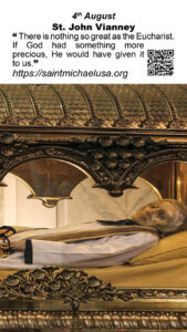 Day 8 – August 3: St. John Vianney, you fervently received Jesus in the Eucharist at each Mass you celebrated. Pray that I am kept free from mortal sin and obtain for me a share in the devotion with which you received Jesus in the Sacrament.