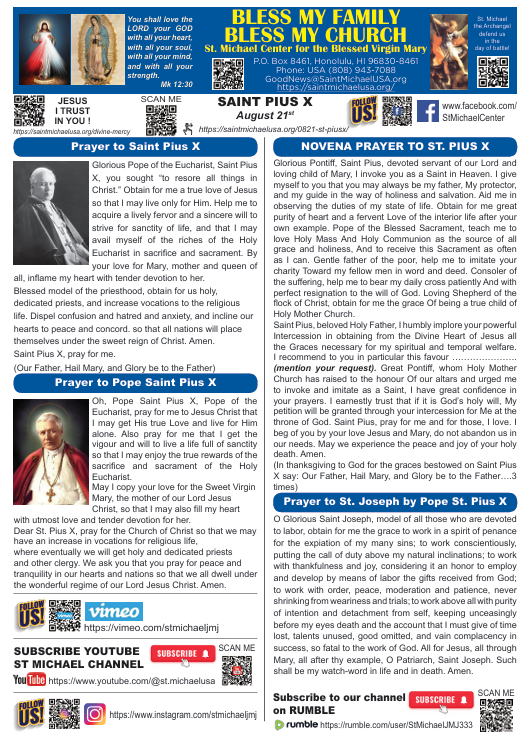 Dear Lord, we thank You for giving us Pope St. Pius X as an example of holiness. Help us to imitate the virtue he showed in his devotion to the true teachings of Your Church.