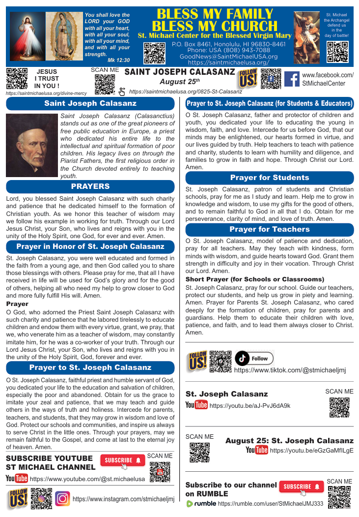 Patron of Catholic schools; founder of the Piarists, dedicated to educating the poor.