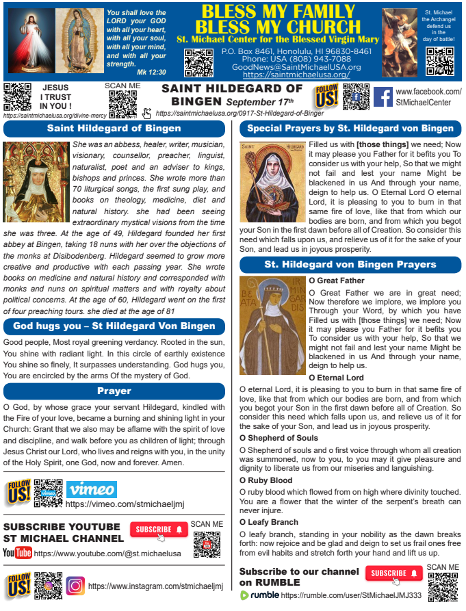 O Lord, you were generous with your gifts of grace to the virgin Hildegard. By following closely her example and teaching, may we pass from the darkness of this life into your marvelous light. Through Jesus Christ our Lord,