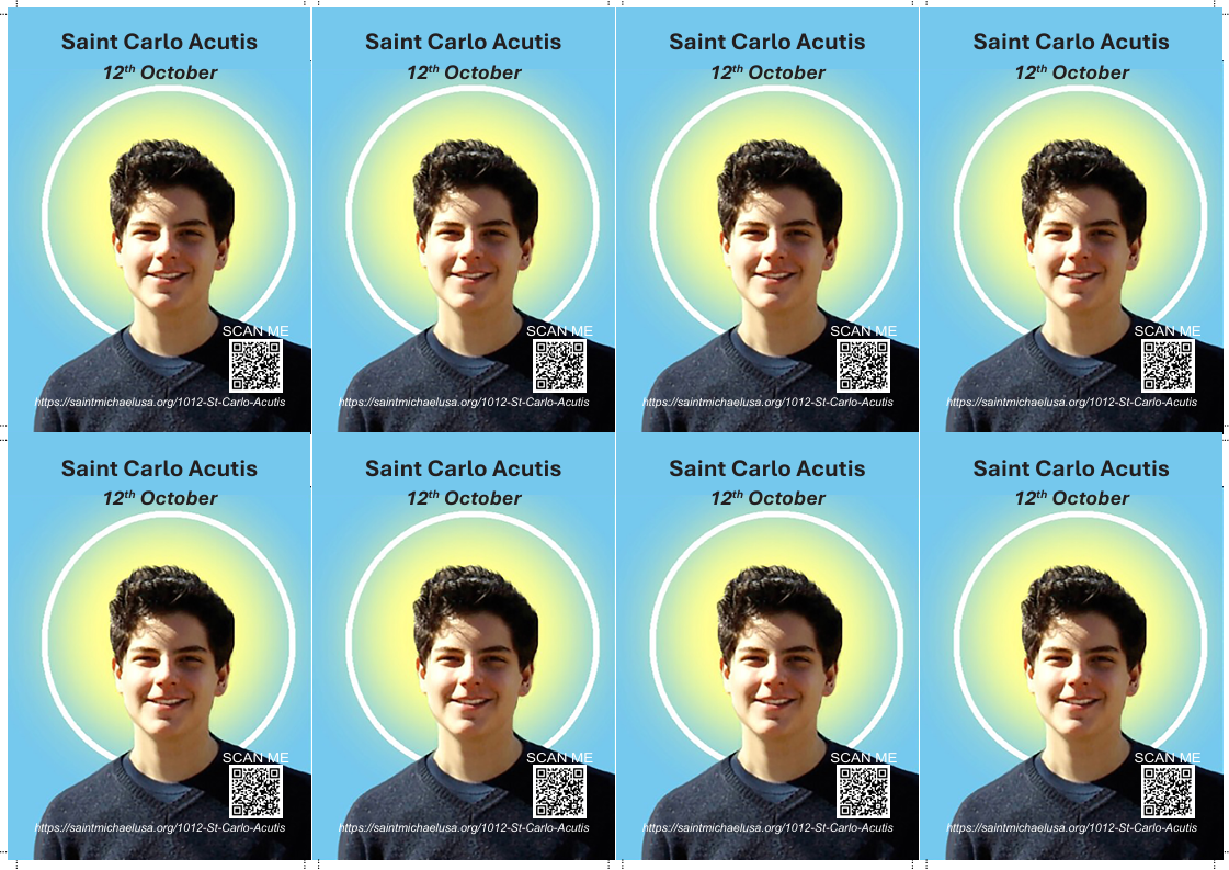 God, Our Father, provider for the poor, champion of the oppressed, defender of the widow and orphan, you called your Saint Carlo Acutis, to be an apostle of the Holy Eucharist and model of Christian youth and holy industry. Through the example of his life and virtue may we follow your Son, Jesus Christ, fulfilling his commandment of charity more closely and building up his Body which is the Church. Let the inspiration of Saint Carlo Acutis inspire us to greater confidence in your love so we may continue his work in spreading your love for us in your Eucharistic Presence. We humbly ask that you glorify Saint Carlo Acutis on earth according to the design of your holy will. Through his intercession, grant the favor I now present (make your request), through Christ our Lord, Amen. (Our Father, Hail Mary, and Glory Be)