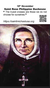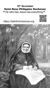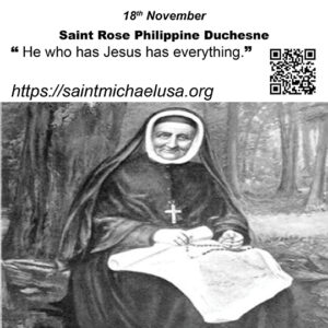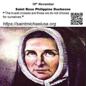 St. Rose was born into a family with wealth and political connections on August 29, 1769 in Grenoble, France. From the young age of eight, St. Rose had a desire to evangelize in the Americas, sparked by hearing a Jesuit missionary speak of his work there. She received a basic education at home from tutors, and religious education from her mother. At the age 19, Rose joined the convent of the Visitation nuns in Grenoble, in 1788 without the permission or knowledge of her family. In 1804 she joined the Society of the Sacred Heart, which sent her to the United States in 1818. She founded a boarding school for daughters of pioneers near St. Louis and opened the first free school west of the Missouri. Two convent schools were founded in Louisiana, at Grand Coteau (1821) and St. Michael’s (1825), and an academy and orphanage in St. Louis, Missouri (1827). She spent her last decade at the convent in Saint Charles, Missouri where she lived austerely and in constant prayer. She died on November 18, 1852 at Saint Charles, Missouri. She was beatified on May 12, 1940 by Pope Pius XII, and canonized July 3, 1988 by Pope John Paul II. She is often referred to as “The Lady of Mercy,” or ” Woman Who Prays Always.”