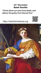 This noble virgin was born in Rome towards the close of the second century, while Alexander Severus was the reigning emperor. Her talent for music was remarkable, and she not only composed and sang hymns, but is said to have invented the organ, consecrating it to the service of God. When she was about sixteen, her parents married her to a young senator named Valerian. He was a pagan, but of a noble and generous nature. Cecilia having revealed to him the vow of virginity she had made, the young husband reverenced her angelic resolution; and Cecilia was the means of converting him and his brother, Tiburtius. to Christianity. After their martyrdom, the young widow was put to the torture, being first immersed in boiling water (from which she emerged unscathed), and then struck with an axe in the head and breast. She lay bleeding from these cruel wounds for the space of three days, praying, and exhorting all who visited her, and at last expired, singing hymns of praise to God. Saint Cecilia is the patroness of sacred music.
