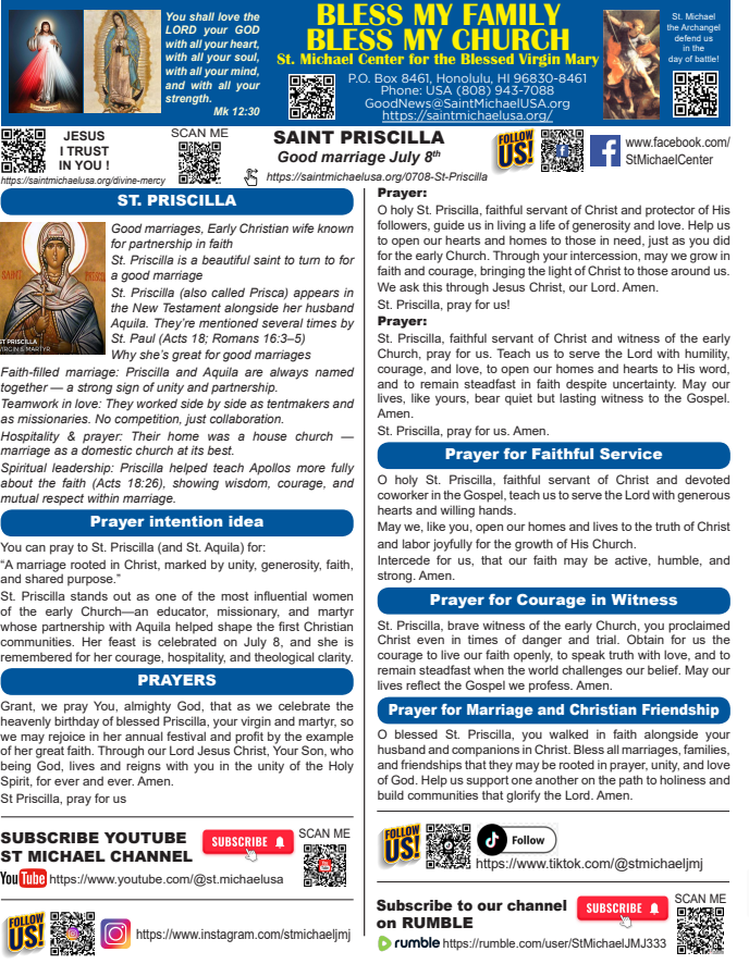 Grant, we pray You, almighty God, that as we celebrate the heavenly birthday of blessed Priscilla, your virgin and martyr, so we may rejoice in her annual festival and profit by the example of her great faith. Through our Lord Jesus Christ, Your Son, who being God, lives and reigns with you in the unity of the Holy Spirit, for ever and ever. Amen.