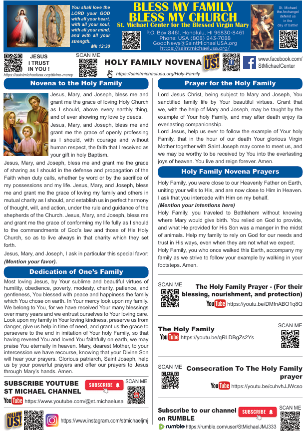 Most loving Jesus, by Your sublime and beautiful virtues of humility, obedience, poverty, modesty, charity, patience, and gentleness, You blessed with peace and happiness the family which You chose on earth. In Your mercy look upon my family. We belong to You, for we have received Your many blessings over many years and we entrust ourselves to Your loving care.