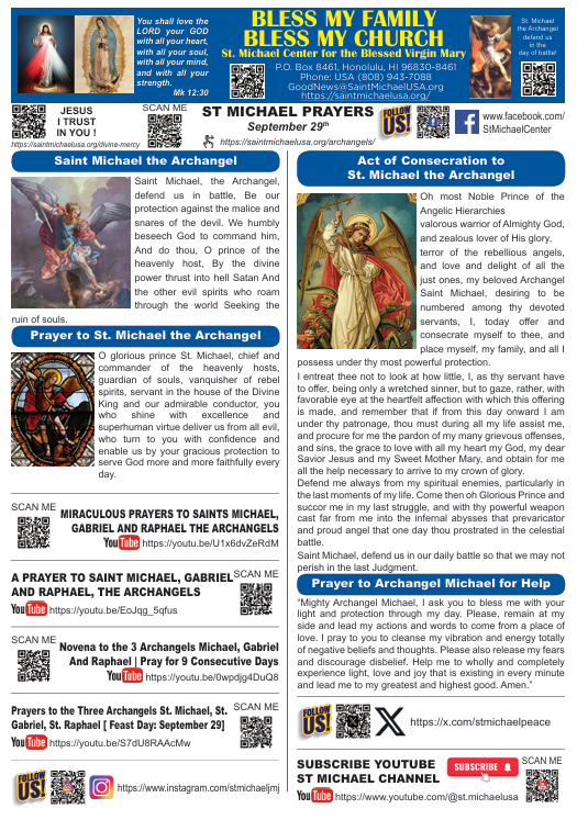 “Saint Michael the Archangel, defend us in battle, be our protection against the wickedness and snares of the devil. May God rebuke him, we humbly pray; and do thou, O Prince of the Heavenly host, by the power of God, cast into hell satan and all the evil spirits who prowl about the world seeking the ruin of souls.”