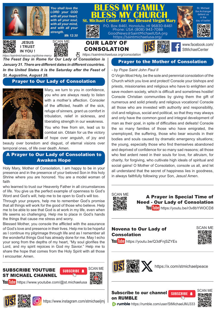 O Virgin Most Holy, be the sole and perennial consolation of the Church which you love and protect! Console your bishops and priests, missionaries and religious who have to enlighten and save modern society, which is difficult and sometimes hostile! Console Christian communities by giving them the gift of numerous and solid priestly and religious vocations! Console all those who are invested with authority and responsibility, civil and religious, social and political, so that they may always and only have the common good and integral development of man as their goal, in spite of difficulties and defeats! Console the so many families of those who have emigrated, the unemployed, the suffering, those who bear wounds in their bodies and souls caused by dramatic emergency situations; the young, especially those who find themselves abandoned and deprived of confidence for so many sad reasons; all those who feel ardent need in their souls for love, for altruism, for charity, for forgiving, who cultivate high ideals of spiritual and social gains! O Mother of Consolation, console us all, and let all understand that the secret of happiness lies in goodness, in always faithfully following your Son, Jesus! Amen.