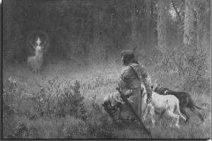 - A forest setting, emphasizing his identity as a hunter-turned-saint