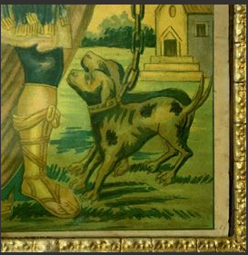 The dog is not incidental—it is a key part of the visual narrative of his conversion and patronage.