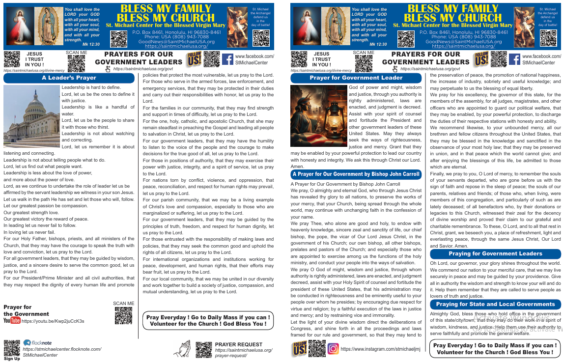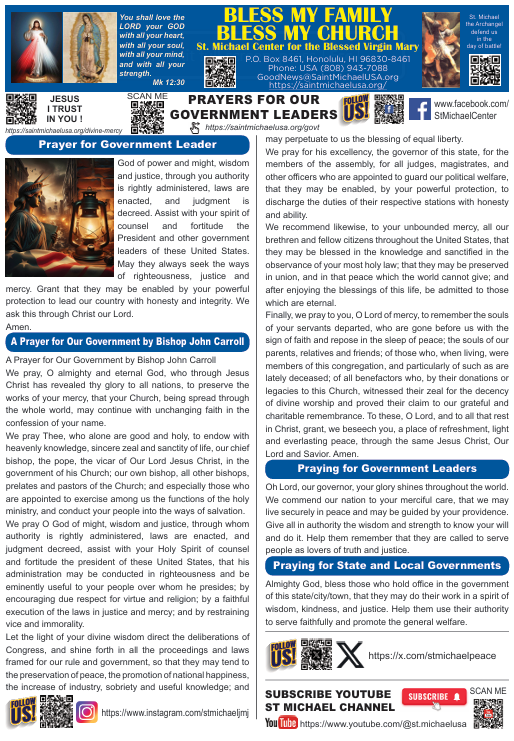 We pray Thee, who alone are good and holy, to endow with heavenly knowledge, sincere zeal and sanctity of life, our chief bishop, the pope, the vicar of Our Lord Jesus Christ, in the government of his Church; our own bishop, all other bishops, prelates and pastors of the Church; and especially those who are appointed to exercise among us the functions of the holy ministry, and conduct your people into the ways of salvation. We pray O God of might, wisdom and justice, through whom authority is rightly administered, laws are enacted, and judgment decreed, assist with your Holy Spirit of counsel and fortitude the president of these United States, that his administration may be conducted in righteousness and be eminently useful to your people over whom he presides; by encouraging due respect for virtue and religion; by a faithful execution of the laws in justice and mercy; and by restraining vice and immorality.