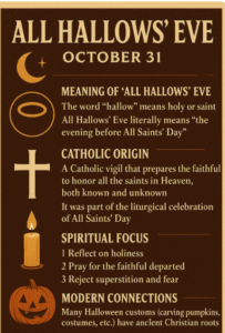 All Hallows’ Eve (October 31) — also known as the Vigil of All Saints — is the evening before All Saints’ Day (November 1) in the Catholic Church.