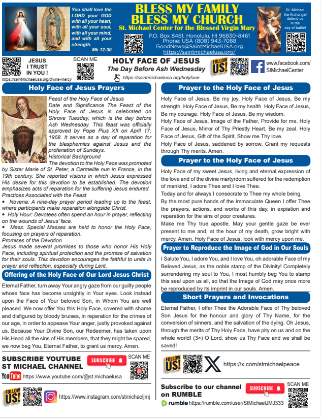 Oh Jesus, through the merits of Thy Holy Face, have pity on us and on the whole world! (3×)