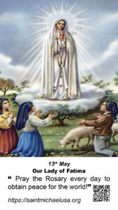 On May 13 is the anniversary of the apparition of Our Lady to three shepherd children in the small village of Fatima in Portugal in 1917. She appeared six times to Lucia, 9, and her cousins Francisco, 8, and his sister Jacinta, 6 between May 13 and October 13, 1917. Mary asked the children to pray the rosary for world peace, for the end of World War I, for sinners, and for the conversion of Russia.