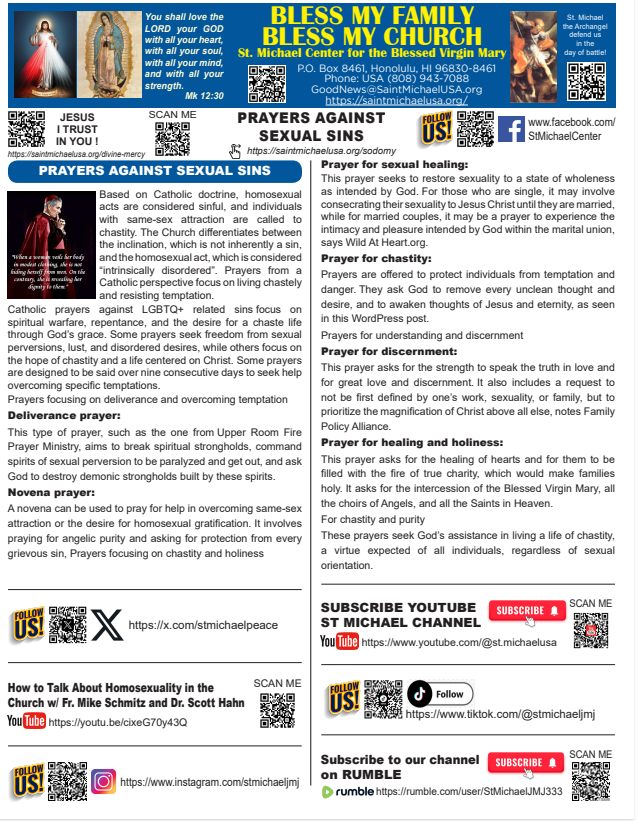 Catholic prayers against LGBTQ+ related sins focus on spiritual warfare, repentance, and the desire for a chaste life through God’s grace. Some prayers seek freedom from sexual perversions, lust, and disordered desires, while others focus on the hope of chastity and a life centred on Christ. Some prayers are designed to be said over nine consecutive days to seek help overcoming specific temptations.